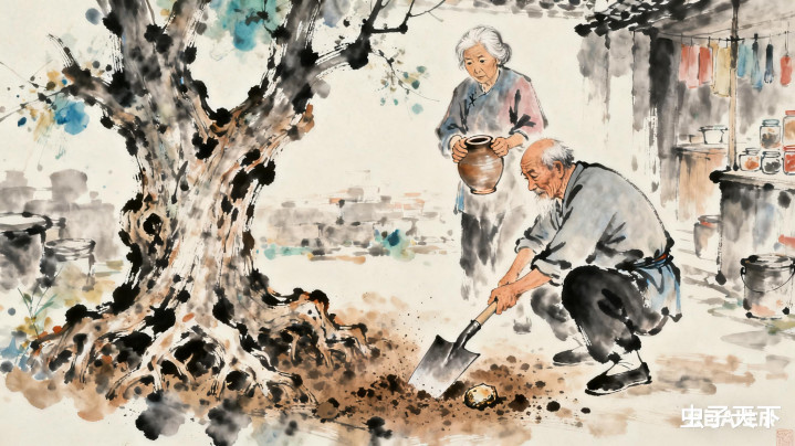 王阿婆攥着空陶罐冲进后院,却见林阿公蹲在槐树下刨土,铁锹"当啷"撞上个硬物。