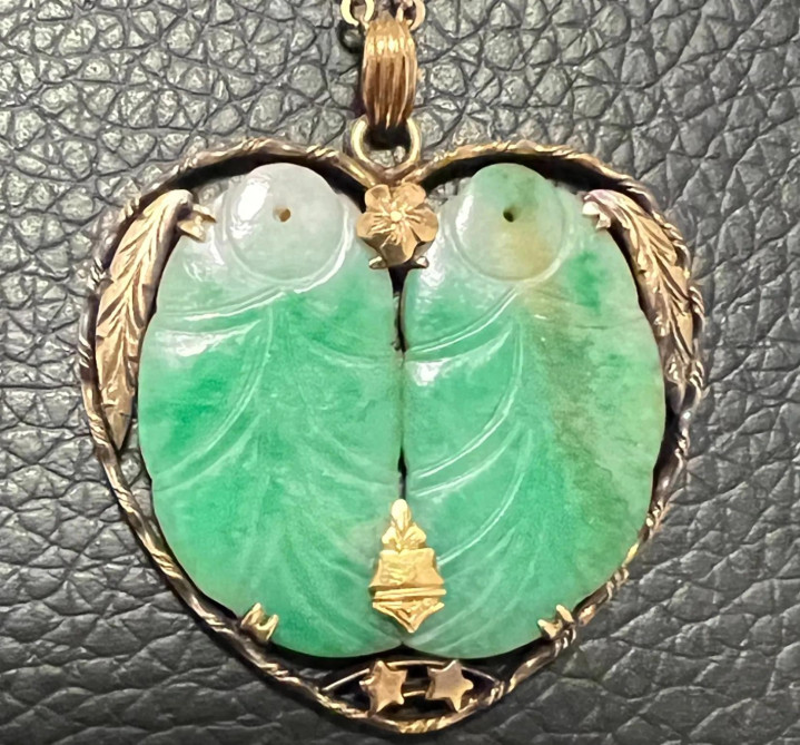 翡翠质量: 挂件主体为翠绿色翡翠,脸色均匀轻柔,透光性适中,相宜清代翡翠偏好“水头足但色不艳”的审好意思。叶片模样的雕琢突显了材质的温润感。 黄褐沁色: 名义的黄褐色沁色是蹙迫的技巧钤记,线路翡翠永恒战争泥土或空气中的矿物资,这种当然酿成的包浆增强了古朴韵味,亦然断代参考依据之一。