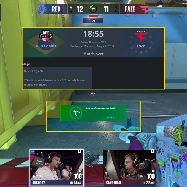 在布达佩斯第一阶段瑞士轮1-2组,FaZe曾面对淘汰,REDCanids在手捏赛点的情况下拆掉炸弹即可淘汰FaZe,但REDCanids选手history聘任拆包不投掷我方背包中的烟雾弹,导致karrigan极限回防将比赛拖入加时并地狱转头……