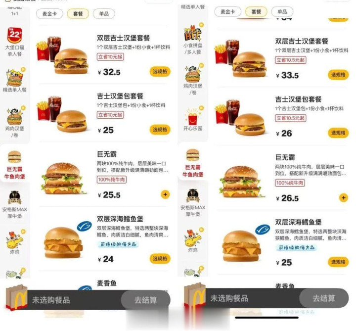 其中巨无霸汉堡价钱高潮1元,双层深海鳕鱼堡高潮1元,麦香鱼高潮1元;在小食方面,麦乐鸡价钱高潮1元、那么大鸡排高潮1块、红油添香小酥肉高潮0.5元、麦麦脆汁鸡高潮0.5元、中份薯条高潮0.5元、脆脆薯条高潮0.5元,玉米杯高潮0.5元,麦旋风和新地高潮0.5元。